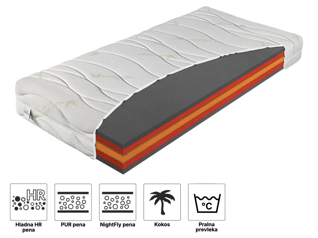 Materialna sestava: PUR pena, NightFly pena, kokos, hladna HR pena, prevleka
