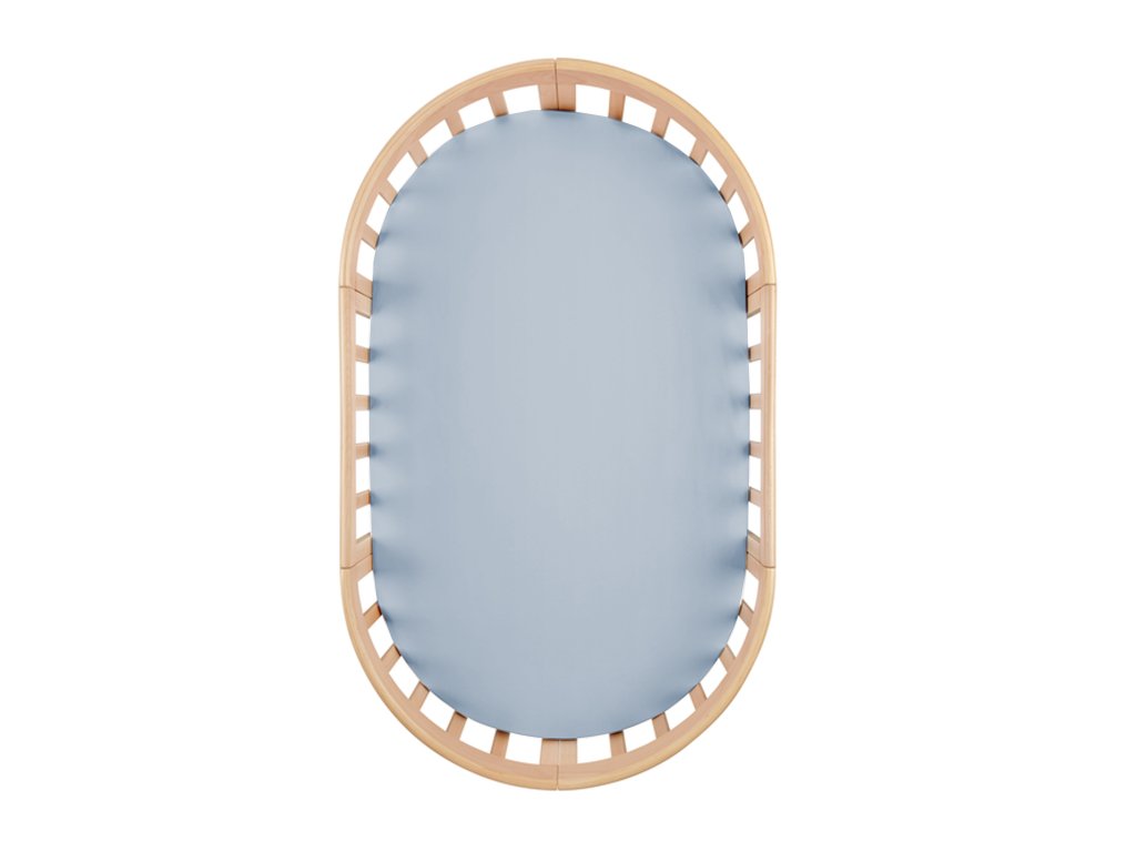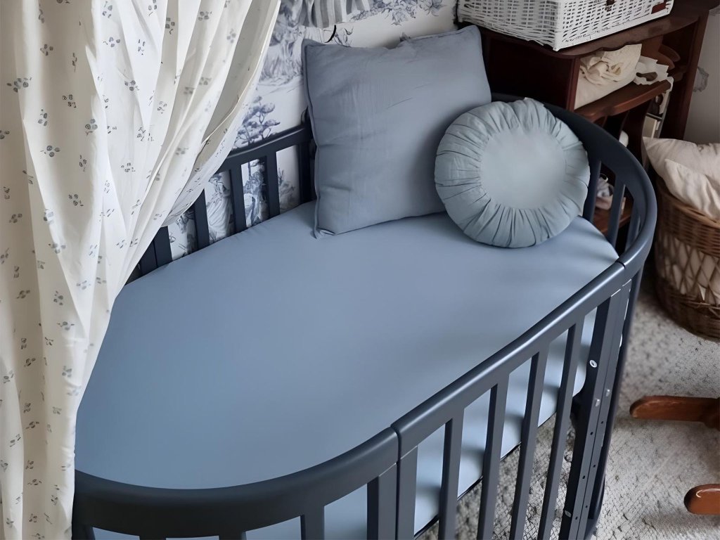 Bombažna rjuha 73x122 cm za ovalno posteljico 7v1 v nebeško modri barvi. Modra rjuha zelo lepo izstopa v sivi in temnosivi rastoči posteljici. Bombažna rjuha za otroško posteljico ima elastično gumo, da se lepo prilagodi in objame atipičen ovalni vzmetnico v rastoči posteljici 7v1. Zahvaljujoč gumi bo rjuha lepo držala na svojem mestu. Barvna otroška rjuha je izdelana iz kakovostnega organskega bombaža s certifikatom Oeko-Tex Standard 100. Bombaž je prijeten, zračen material, ki omogoča optimalno kroženje zraka in ne zadržuje vlage, ki bi se morebiti lahko nabirala v vzmetnici. Bombaž podpira odvajanje vlage.