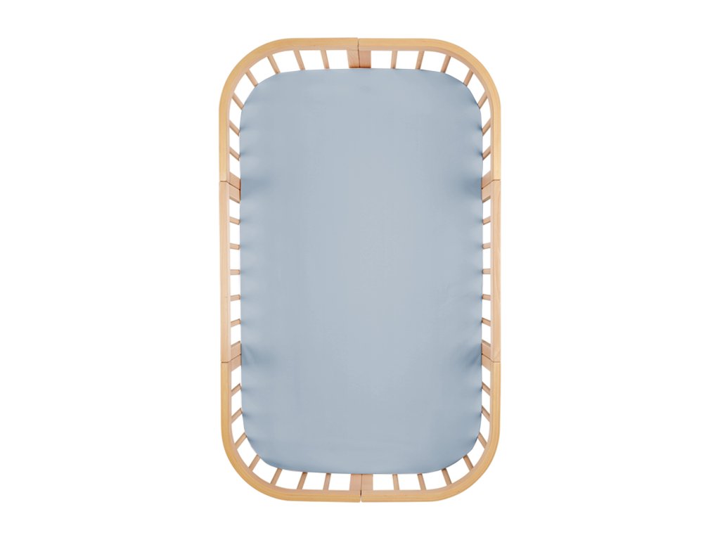 Svetlo modra elastična rjuha 73x122 cm za leseno rastočo posteljico 7v1 izdelana iz kakovostnega organskega bombaža. Bombažna rjuha za otroško posteljico ima elastično gumico, da se lepo prilagodi in objame atipično obliko vzmetnice v rasteči posteljici 7v1. Gumica rjuho lepo drži napeto in na svojem mestu. Barvna otroška rjuha je izdelana iz kakovostnega organskega bombaža s certifikatom Oeko-Tex Standard 100, ki ne vsebuje kemičnih snovi, zato je varna za otroško kožo. Bombaž omogoča optimalno kroženje zraka in ne zadržuje vlage, ki bi se morebiti lahko nabirala v vzmetnici. Bombaž podpira odvajanje vlage. Rjuha je na voljo v več barvah in velikostih.