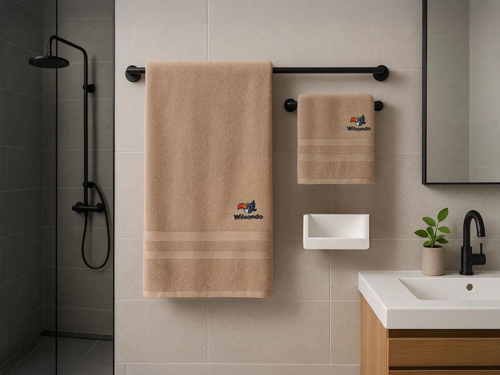 Bež brisača Wilsondo v kompaktni velikosti 50×30 cm je idealna za roke, obraz ali kot praktična brisača za potovanja. Izdelana je iz 100 % frotirne bombaža z gramaturami 400 g/m², zaradi česar je mehka, prijetna na dotik in hkrati odlično vpija vodo. Ojačana dvojna zanka in trdno zašit rob zagotavljata dolgo življenjsko dobo tudi pri pogosti uporabi. Diskretni logotip Wilsondo daje brisači čist in eleganten videz, ki se zlahka prilega vsaki kopalnici ali potovalni opremi.
