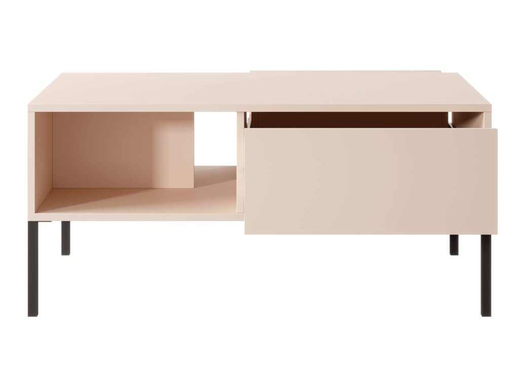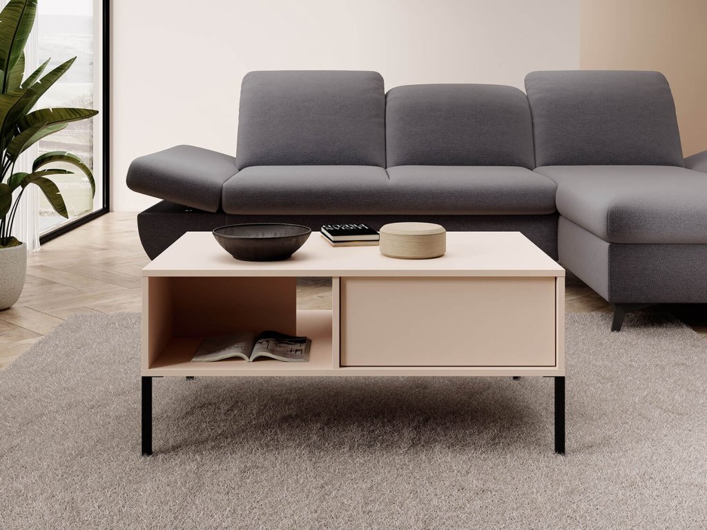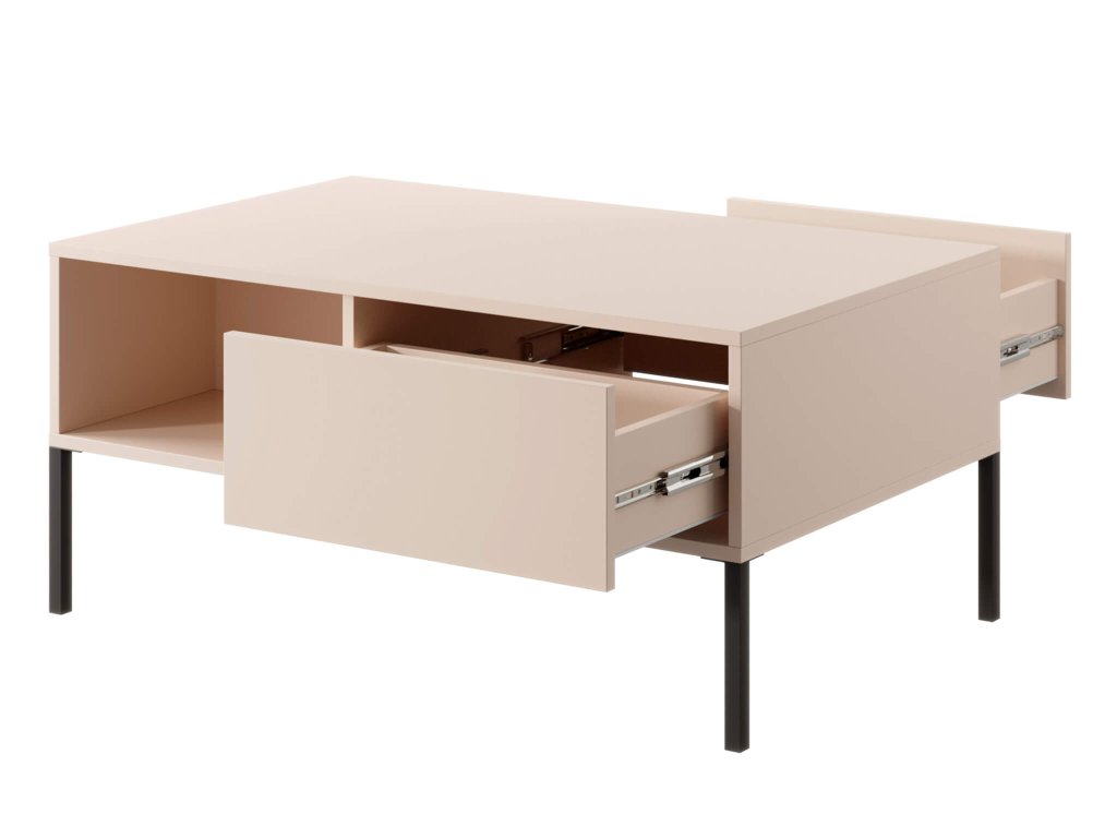 Moderna konferenčna miza Dast je eleganten kos pohištva iz dnevne kolekcije Dast, ki bo postal odličen dodatek vsakega doma. V kombinaciji bež barve s črnimi kovinskimi nogami deluje ta miza zelo elegantno in okusno. Konferenčna miza Dast ponuja dva predala nasproti drugemu, ki sta opremljena s sistemom odpiranja push-to-open. Ta sistem omogoča odpiranje predalov s pritiskom, brez potrebe po vlečenju kovinskih ročajev, ki bi sicer pokvarili čist vizualni videz pohištva. Poleg tega ima konferenčna miza tudi dve odprti polici z obeh strani, ki zagotavljata dovolj prostora za shranjevanje različnih predmetov, kot so knjige, revije ali dekorativni elementi. Miza je izdelana iz kakovostne laminirane plošče, ki je odporna na praske in odporna na vlago. Vsi robovi so zaščiteni s kakovostnimi ABS robovi, ki zagotavljajo dodatno zaščito pred mehanskimi poškodbami. Rezultat je moderna, elegantna in praktična konferenčna miza, ki bo popoln dodatek vsake dnevne sobe, pisarne ali drugega prostora, kjer potrebujete prostor za sprostitev ali za delovne sestanke in konference.