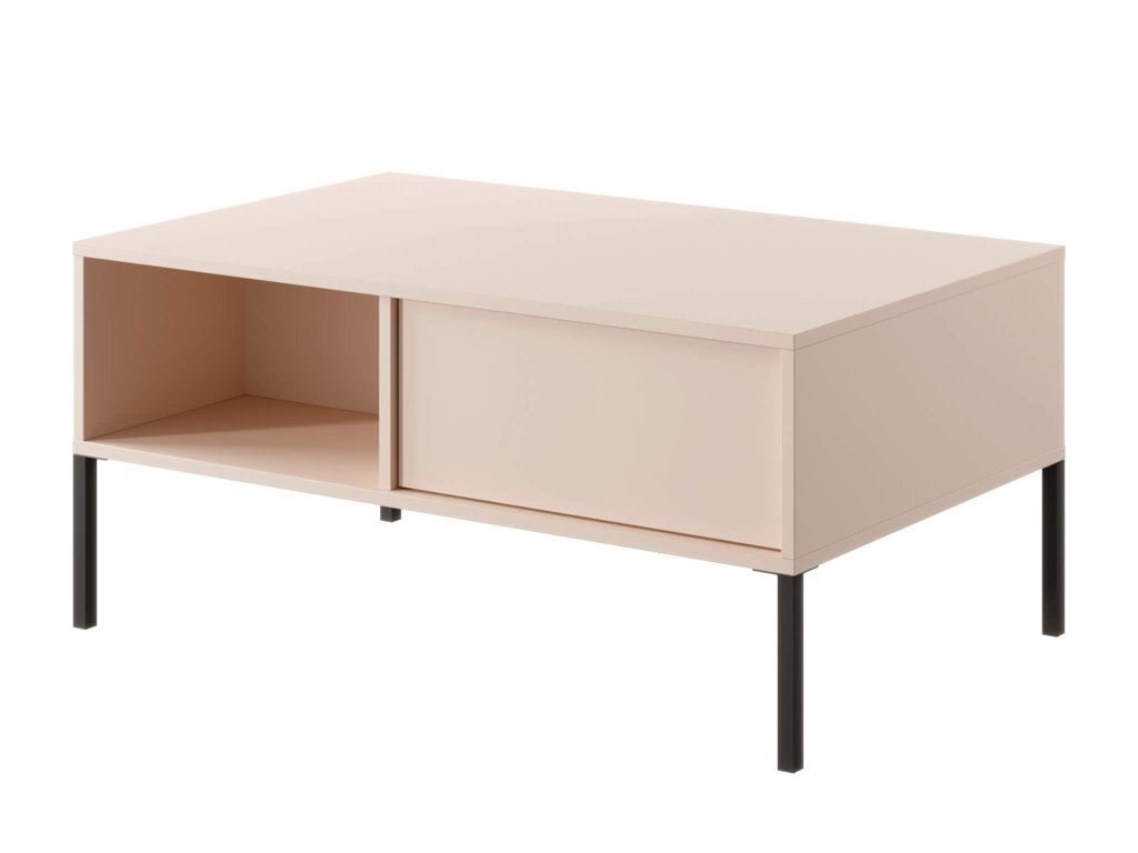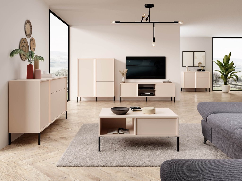 Predstavljamo vam moderno pohištveno kolekcijo Dast, ki se popolnoma prilega vaši dnevni sobi in ji doda pravi šarm. Ta kolekcija je izdelana iz kakovostne laminirane iverne plošče in ima nežno bež barvo, ki deluje prijetno in sproščujoče. Črne kovinske nogice, na katerih stoji ta kolekcija, dajejo pohištvu stabilnost in moderen videz. Sistem odpiranja push-to-open, s pritiskom, je še ena odlična rešitev, ki poenostavi ravnanje s pohištvom in zagotavlja gladko in tiho odpiranje vrat in predalov. Kolekcija Dast je zasnovana tako, da izpolnjuje vse vaše zahteve in se popolnoma prilagaja vašim potrebam. Del te kolekcije so različne vrste komod ali mizic, ki jih lahko enostavno kombinirate in si tako ustvarite lasten dizajn. Uživajte v udobju in estetiki v enem s pohištveno kolekcijo Dast. To pohištvo je odlična izbira za vsakogar, ki želi uživati v popolni kombinaciji kakovosti, stila in udobja.