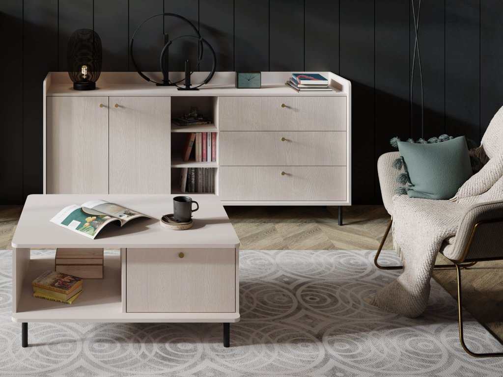GRANDE je moderno pohištvo za dnevno sobo v svetli peščeni barvi. Ko si posamezne kose podrobneje ogledate, opazite kombinacijo gladkih in strukturiranih plošč. Zanimiv detajl je tudi dvignjen rob v zgornjem delu pohištva, zaradi katerega lahko dobro izkoristite zgornjo ploščo. Poleg praktične strani to kolekcijo odlikujejo tudi besede nežnost in eleganca. Te lastnosti poudarja svetel odtenek pohištva, elegantni ročaji v zlati barvi in visoke črne nogice. Nenazadnje je treba omeniti, da se bež barva zlahka kombinira in si boste k temu pohištvu lahko mirno kupili manjši kavč ali prostorno sedežno garnituro v svoji najljubši barvi.