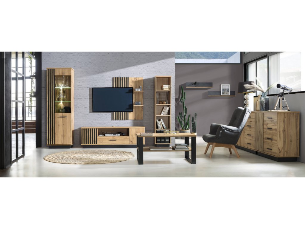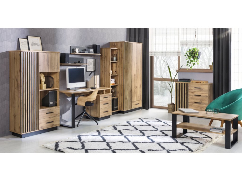 Pohištvo iz kolekcije LAMELO je brezčasen kos, ki poudari vsak del notranjosti. Pohištvo popolnoma izpolni svojo funkcijo v dnevni sobi, pisarni ali jedilnici. Kolekcija Lamelo je sestavljena iz barvne kombinacije hrast wotan/črna, ki prinaša v vsak dom izjemne elemente luksuza. Robovi so obdelani s kakovostnim PVC furnirjem, ki ščiti pohištvo pred obrabo. Pohištvo ima sistem brez ročajev v enem delu, ki je dopolnjen s plastičnimi ročaji v črni barvi.