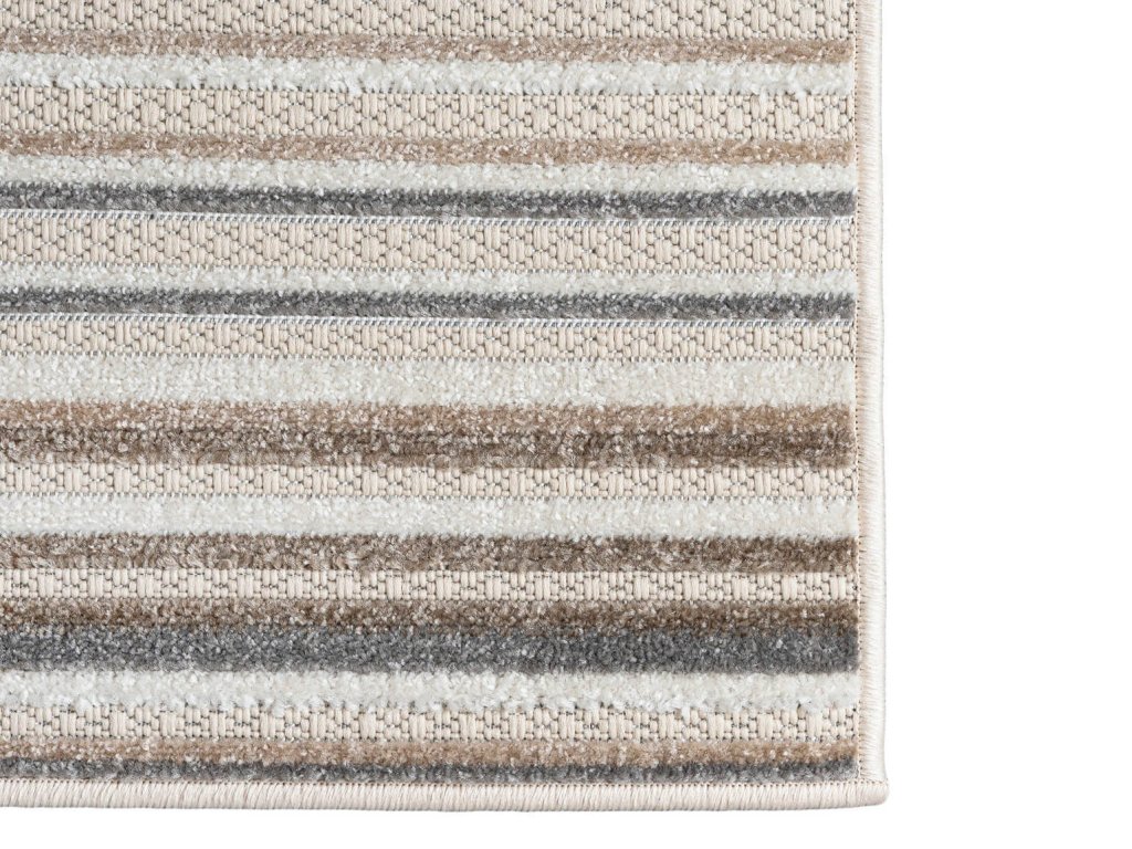 Bež preproga z gostoto ščetin 1500g/m2 in nizkim vlaknom 6 milimetrov. Izdelana je iz polipropilenskih vlaken, ki so mehka in prožna. Preproga se nedeformira in se odlikuje z visoko odpornostjo proti obrabi. Cenili boste enostavno vzdrževanje zaradi nizkega vlakna. Črtasta preproga se bo prilegala v dnevno sobo, spalnico ali otroške ali študentske sobe. Oživi sodoben in tradicionalen interier vašega doma.