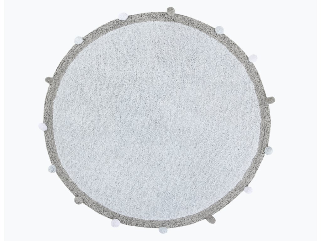 Otroška preproga Bubbly 120x120 cm modra je okrogla preproga s sivim robom in cofki, izdelana iz 100% bombaža. Preproga izgleda odlično v fantovskih sobah, zahvaljujoč nežni in elegantni kombinaciji pastelnih barv. Ročno izdelana preproga je za otroke varna, saj se uporabljajo le naravna barvila. Ima več certifikatov ISO 9001, ISO 14001 in ISO 18001, kot tudi certifikate AITEX, ki zagotavljajo kakovost obdelave za zdravje in varnost uporabnika. Zahvaljujoč uporabi bombaža je mehka, lahka in prožna, idealna za otroško sobo. Doda notranjosti udobje in moderen dizajn ter duši zvoke otrok, ki tečejo po njej.