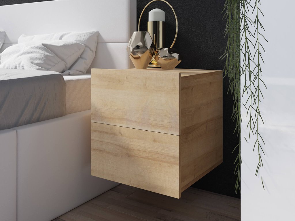 Nočna omarica Calabrini. To pohištvo je izdelano iz kakovostne laminirane iverne plošče, kar zagotavlja njegovo trajnost in eleganten videz. S PVC robovi je zagotovljena zaščita pred praskami in odrgninami. Omarica ima dva praktična predala, ki zagotavljata dovolj prostora za shranjevanje vaših potrebščin. S odpiranjem z vlečenjem za štrleče predale ne potrebujete več neokusnih ročajev. Ta moderna nočna omarica je na voljo v treh elegantnih barvah - bela, črna in zlati hrast, kar vam omogoča, da jo prilagodite slogu in barvam vaše spalnice. S plastičnimi nogicami je zagotovljena stabilnost in zaščita pred praskami tal. Poleg tega ponuja možnost obešanja na steno, kar vam omogoča prihranek prostora in ustvarjanje modernega in elegantnega videza. Nočna omarica Calabrini je kombinacija modernega dizajna, funkcionalnosti in praktičnih lastnosti, ki zagotavljajo prostor za shranjevanje in enostavno upravljanje. Ne glede na to, ali izberete belo, črno ali zlato hrastovo različico, bo Calabrini odličen spremljevalec za vašo spalnico.