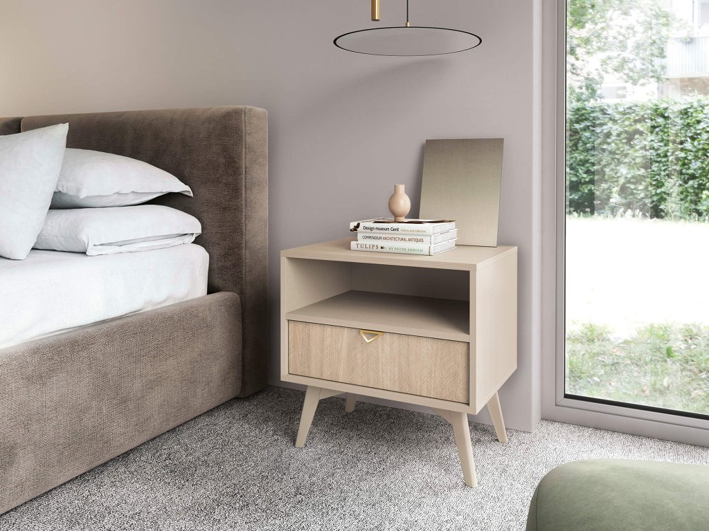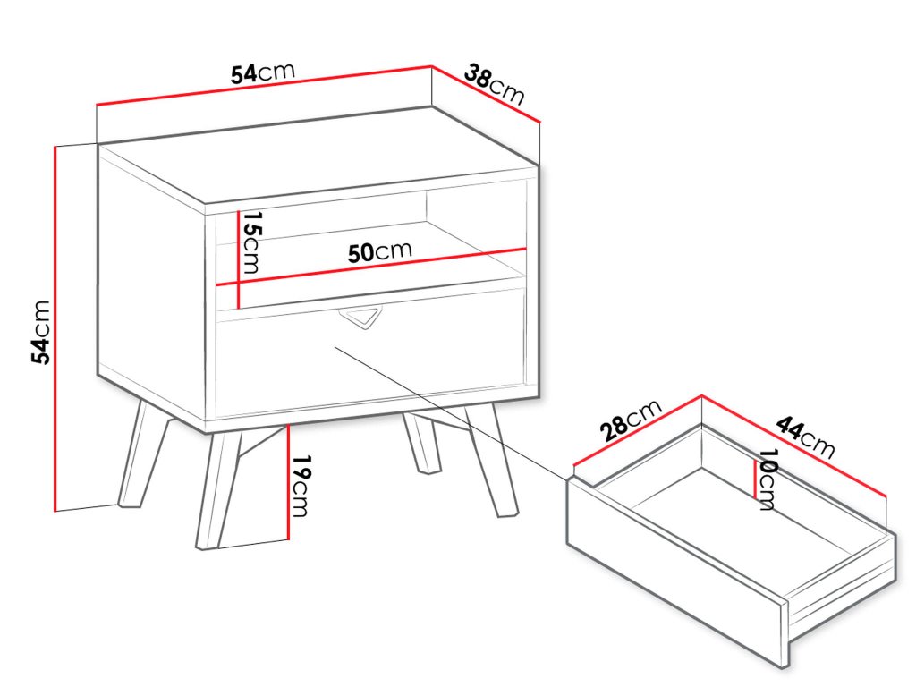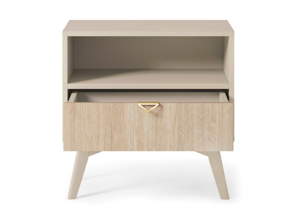 Nočna omarica Forest je eleganten dodatek v vašo spalnico, ki prinaša v vaš notranji prostor edinstven slog. Ta omarica je izdelana iz kakovostne laminirane 16 mm plošče, kar zagotavlja njeno odpornost proti običajnim vplivom obrabe. Robovi omarice so zaščiteni z ABS robovi, kar celotnemu kosu pohištva dodaja še večjo trdnost in zaščito. Ena glavnih značilnosti omarice Forest je njena čudovita bež barva, ki prostoru okoli nje dodaja prijetno in harmonično vzdušje. Predal te nočne omarice je okrašen s stilskim vzorcem ribje kosti, kar pohištvu dodaja poseben šarm in stilski videz. Nočna omarica Forest ima en predal, ki zagotavlja praktičen prostor za shranjevanje vaših osebnih predmetov ali knjig. Poleg tega ima omarica tudi eno odprto polico, ki vam omogoča shranjevanje drugih manjših predmetov. Noge omarice Forest so izdelane iz kakovostnega bukovega lesa, kar pohištvu dodaja trdnost in stabilnost. Aluminijasti ročaj na predalu je zlat, kar celotni omarici dodaja eleganco in luksuzen pridih. Nočna omarica Forest je idealen dodatek v vašo spalnico, ki ne le da služi svojemu namenu kot nočna omarica, ampak tudi prinaša v vaš dom lepoto skandinavskega dizajna.