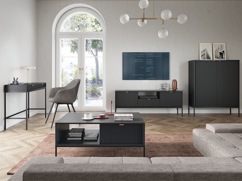 Izjemno elegantna in stilska kolekcija NOVA ne sme manjkati v nobenem interierju ljubiteljev modernega dizajna. Okrasni žlebljeni sprednji deli pohištva se čudovito dopolnjujejo z brušenimi zlatimi ročaji iz aluminija. Lahkotnost pohištva dodaja črna kovinska konstrukcija z visokimi nogicami. S kolekcijo Nova si boste sestavili moderno dnevno sobo, vendar lahko nekatere kose postavite tudi v predsobo, jedilnico ali spalnico. Korpus pohištva je sestavljen iz laminirane DTD plošče, medtem ko žlebljena čela pohištva sestavlja kakovostna MDF plošča.