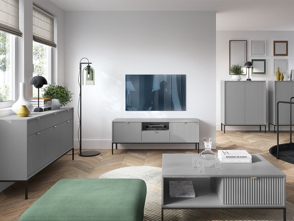 Izjemno elegantna in stilska kolekcija NOVA ne sme manjkati v nobenem interierju ljubiteljev modernega dizajna. Okrasni žlebljeni sprednji deli pohištva se čudovito dopolnjujejo z brušenimi zlatimi ročaji iz aluminija. Lahkotnost pohištva dodaja črna kovinska konstrukcija z visokimi nogicami. S kolekcijo Nova si lahko sestavite moderno dnevno sobo, vendar lahko nekatere kose postavite tudi v predsobo, jedilnico ali spalnico. Korpus pohištva je sestavljen iz laminirane DTD plošče, medtem ko žlebljena čela pohištva sestavlja kakovostna MDF plošča.