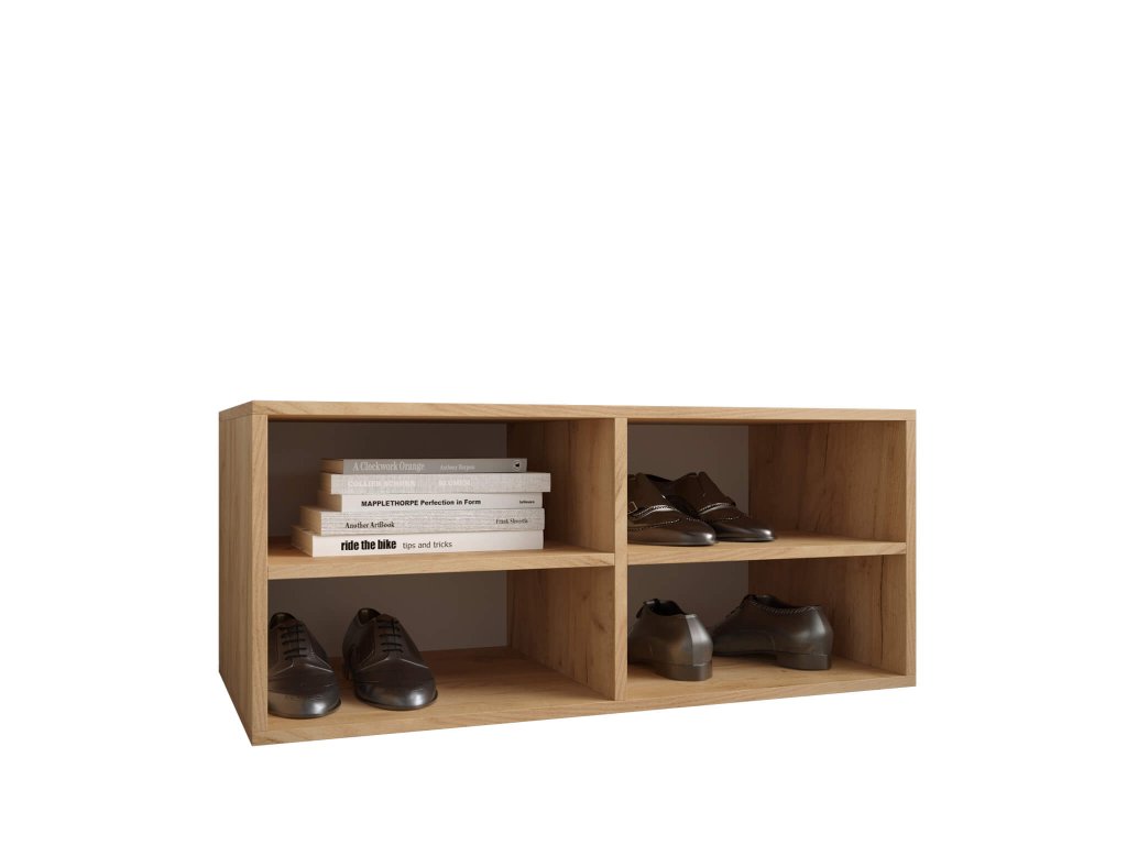 Preprost omarica za čevlje Miro v barvi zlati hrast craft za organizacijo vaših čevljev. Sodobna odprta polica za obutev je idealna za vsak dom. Univerzalna in hkrati preprosta izvedba se zlahka ujema s katerim koli notranjim prostorom. K omarici za čevlje je usklajen tudi panel z obešalniki, ki ga lahko obesite na višino, ki vam ustreza. Stenski obešalnik bo popolnoma dopolnil vašo predsobo. Na podstavku obešalnika so 4 kovinski obešalniki v črni barvi. Omarica za čevlje je izdelana iz kakovostne laminirane plošče debeline 16 mm. Robovi so zaščiteni s PVC furnirjem. Zadnji del je izdelan iz HDF plošče. Elegantna omarica za čevlje vam ponuja 4 predelke za shranjevanje vaše obutve.
