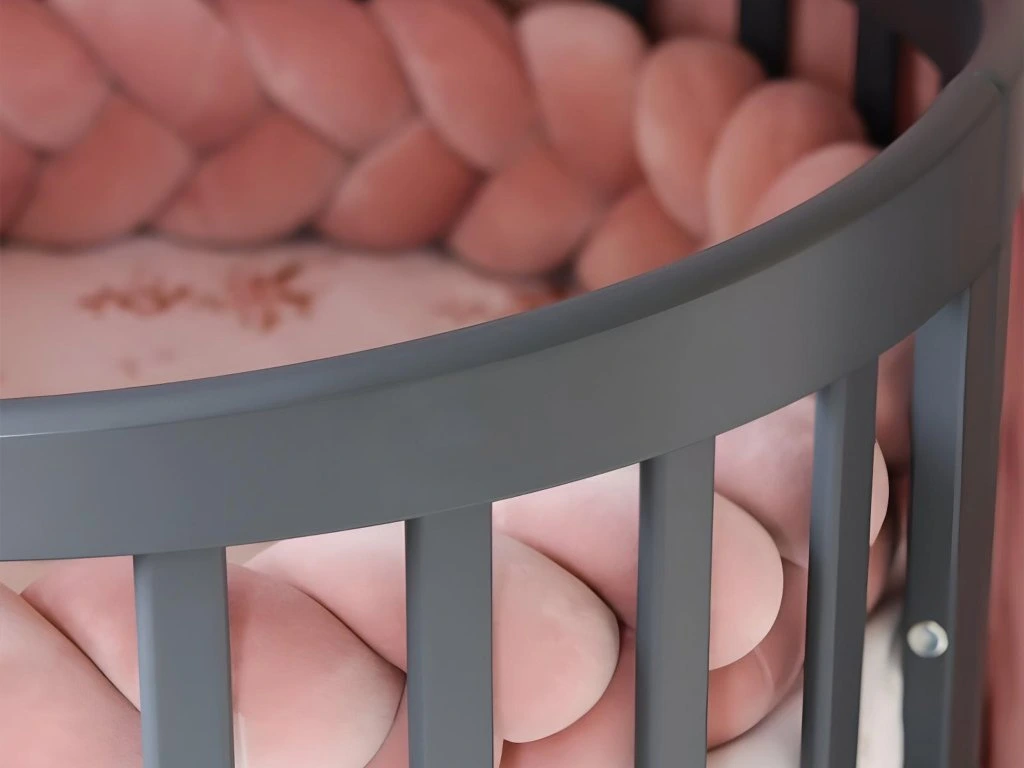 Okrogla rastoča posteljica je izdelana iz bukovega lesa in ima ekološki premaz na vodni osnovi, ki ustreza evropskemu standardu EN 71-3. Premaz je varen za otroke in odporen proti mehanskim poškodbam. Troslojna vzmetnica je izdelana iz pene T25 z bombažno prevleko. Prevleko je mogoče prati pri 30 °C. Ležišče v posteljici je mogoče nastaviti v 5 položajev, od 7 cm do 49 cm v najvišjem položaju. Če na posteljico namestite gumijasta kolesa, bo višina ležišča v najvišjem položaju 55 cm.