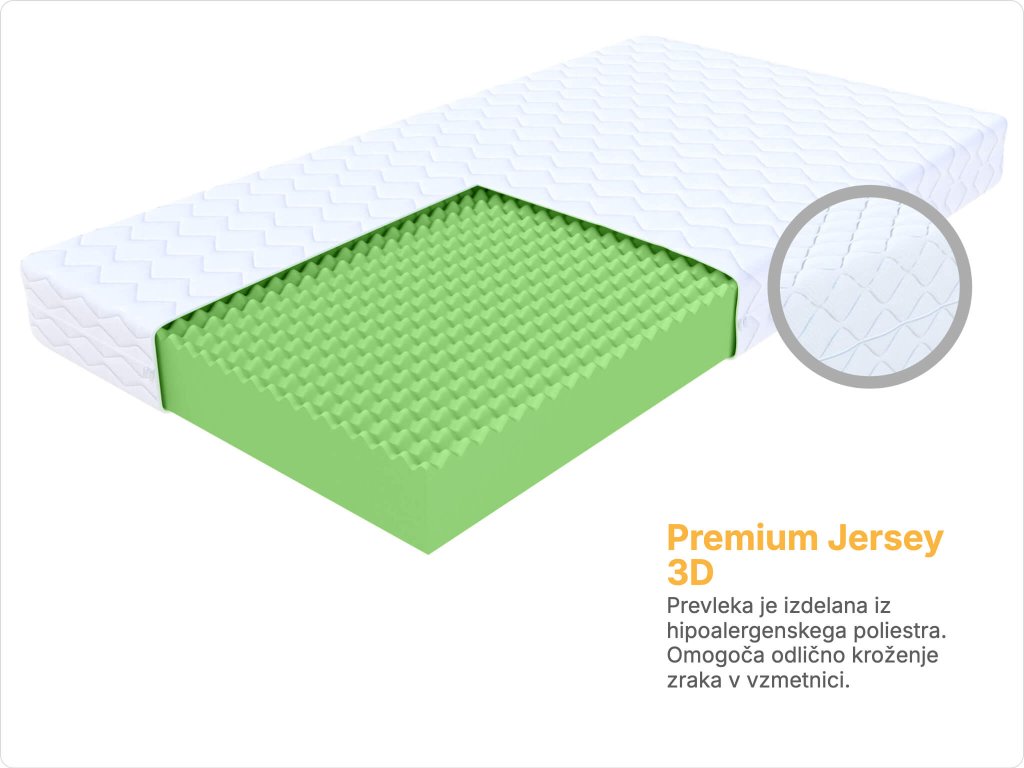 Vzmetnica ima prevleko na zadrgo in jo je mogoče prati v pralnem stroju na 30°C. Prevleka Premium Jersey 3D ima antialergijske lastnosti. Omogoča odlično kroženje zraka v vzmetnici.
