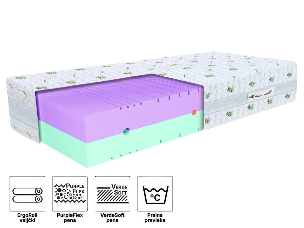 Materialna sestava: PurpleFlex pena, VerdeSoft pena, ErgoRoll valjčki, prevleka Aloe Vera
