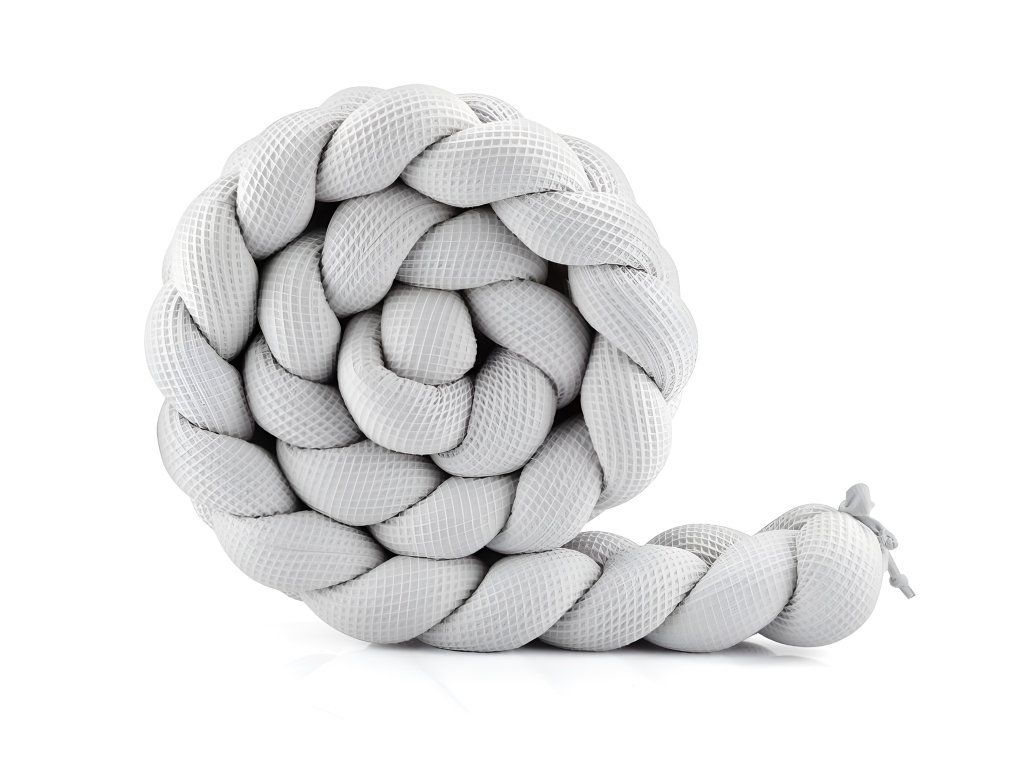 Svetlo siva pletenica za posteljico je dolga 210 cm in ima višino približno 18 cm, da lepo obkroži dojenčka v otroški posteljici. Če pletenico postavite v manjšo kvadratno rastočo posteljico, bo prekrila do 3/4 posteljice. Pri večji posteljici jo lahko postavite na primer v obliki črke U okoli dojenčkove glavice. Pletena pletenica za posteljico ima zanimivejši dizajn, vendar služi enako dobro kot klasična zaščitna ograja. Pletenica za posteljico zanesljivo zaščiti otroka, ki se začne v posteljici več gibati, da se ne udari ob lesene prečke posteljice.