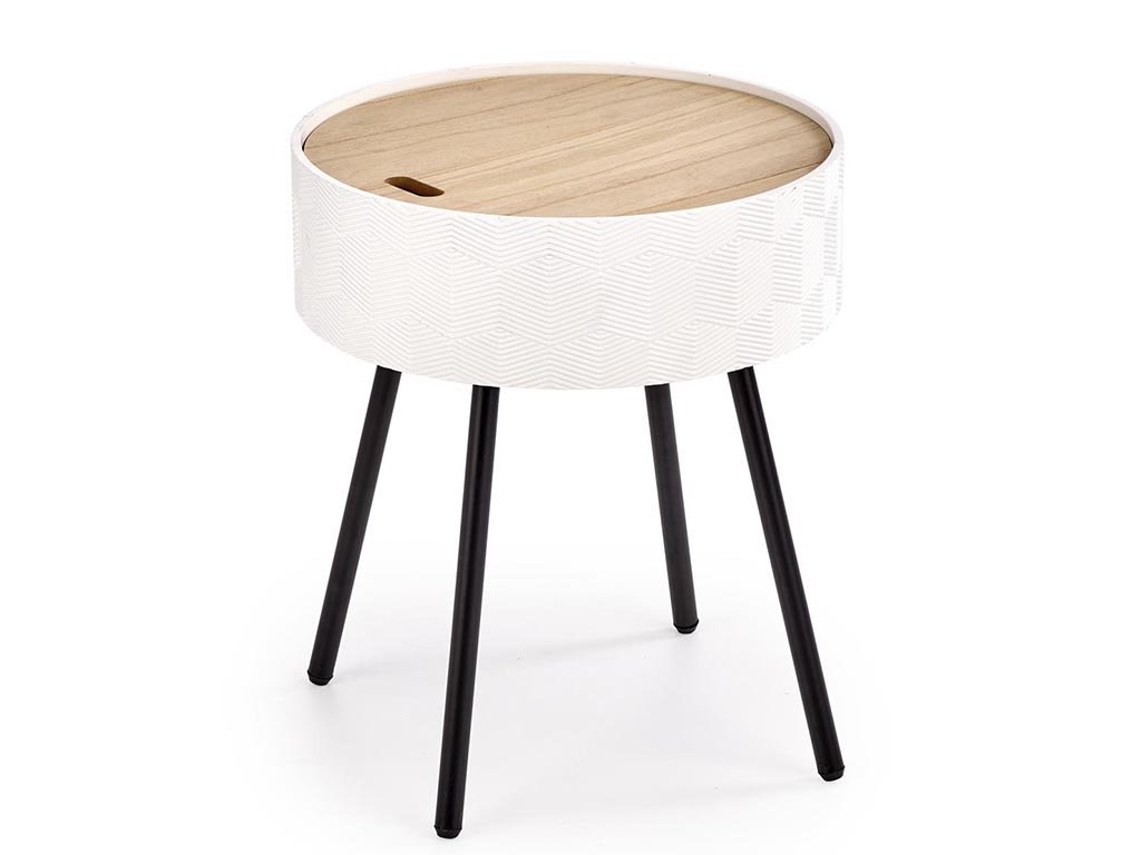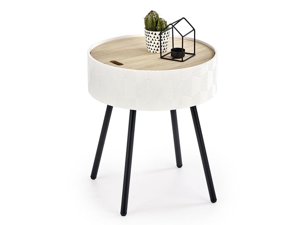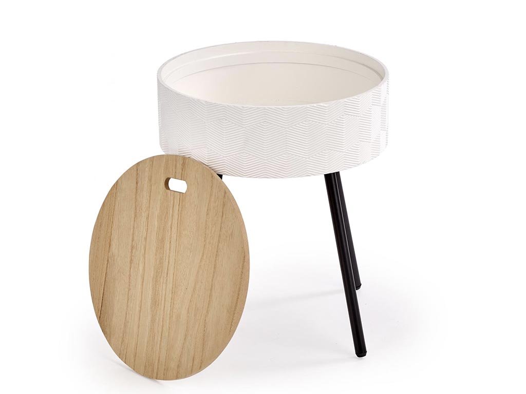 Želite počivati v svojem najljubšem naslanjaču in imeti pri roki razbrano knjigo? Kraj, kjer boste odložili skodelico okusne kave? Priročna mizica Aura vas bo navdušila s svojim elegantnim videzom in poleg tega presenetila z odlagalnim prostorom. Stilni kos stoji na stabilnih črnih nogicah iz prašno lakiranega jekla. Zgornji del mizice je iz kakovostne lakirane MDF in naravnega furnirja, shranjevalni prostor je v beli izvedbi. S svojim preprostim videzom ga boste lepo kombinirali z ostalimi kosi pohištva, bodisi doma, v čakalnici ali na terasi.