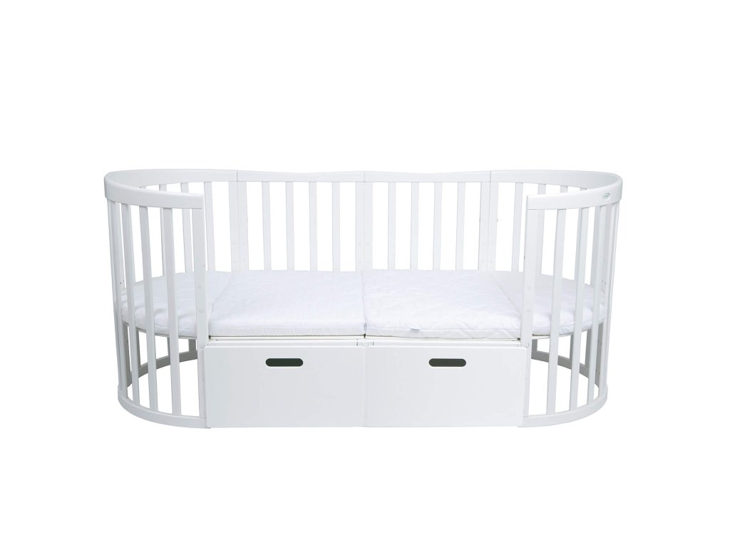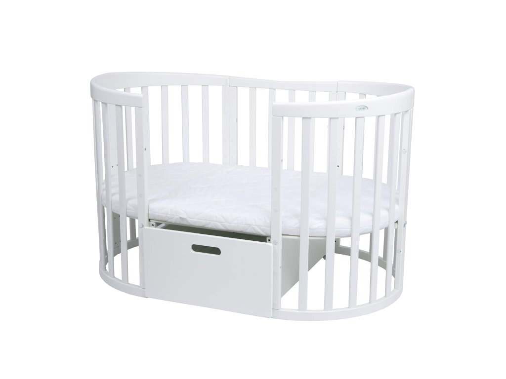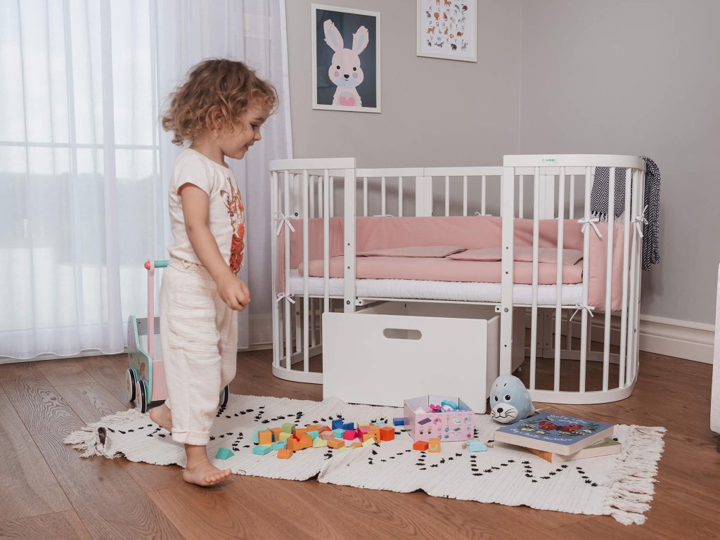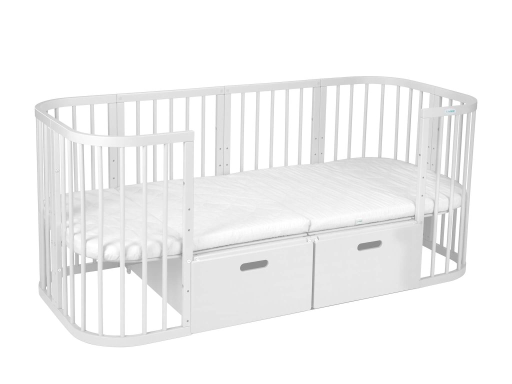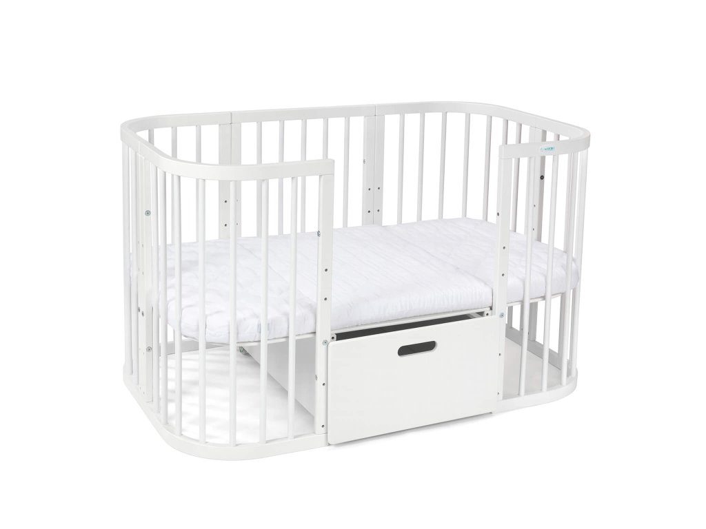 Praktična shranjevalna škatla pod rastoče posteljice 7v1. Predal se prilega pod klasično in pod ovalno rastočo posteljico 7v1. Ko odprete stranico posteljice in nastavite rešetko na pravo višino, se bela shranjevalna škatla lepo prilega v nastali prostor pod posteljico. V škatlo lahko otroci na primer odlagajo igrače ali pa imate v njej shranjene blazine in odeje.