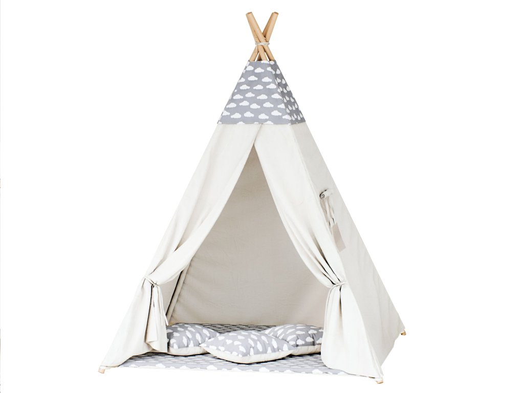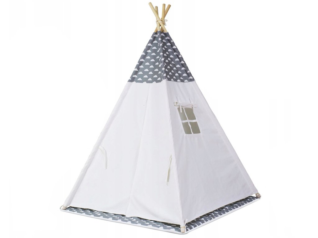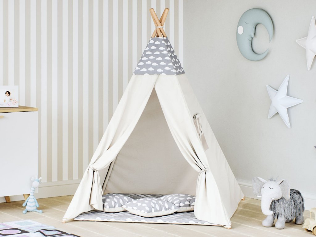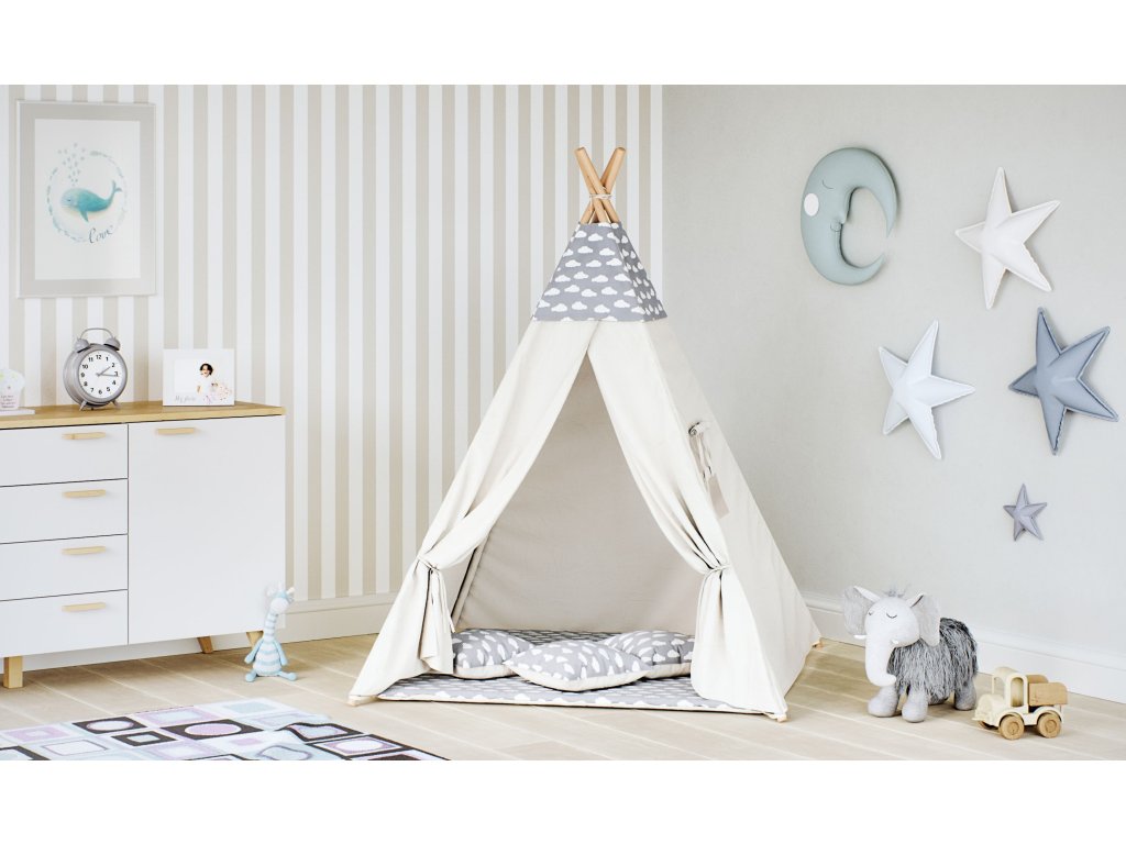 Teepee šotor otrokom vzbuja občutek varnosti, zavetja in določa njihovo zasebno območje za igro ali počitek. Uporabljate ga lahko ne le v notranjosti, ampak tudi zunaj ali na terasi. Šotor je lahek in enostavno zložljiv, lahko ga vzamete kamorkoli. Šotori so pri otrocih zelo priljubljeni, lahko se v njem igrajo, norijo ali samo počivajo. Okvir je sestavljen iz 4 palic s premerom 22 mm in dolžino 180 cm. Del kompleta je tudi praktična podloga, ki izolira od hladne zemlje, kar povečuje udobje igre. Podloga ni trdno pritrjena na šotor. Blazine in okno z zaveso bodo malim raziskovalcem nudili odlično zabavo. Tkanino teepee šotora je mogoče ročno prati do 30 stopinj, ni priporočljivo uporabljati agresivnih čistilnih sredstev.