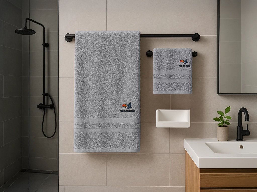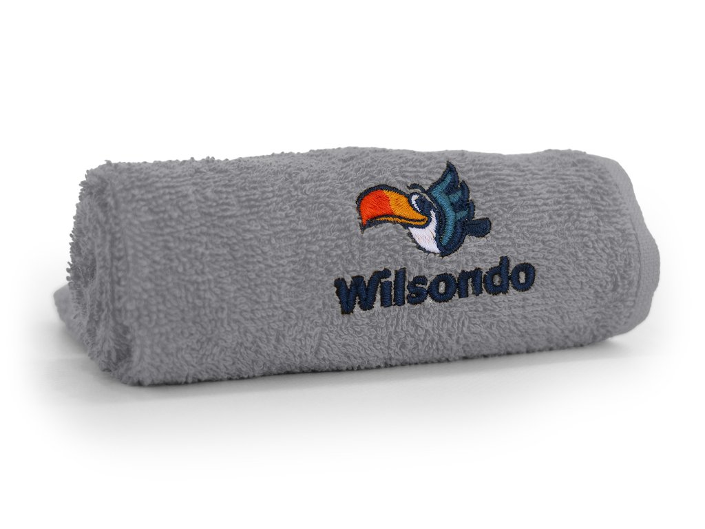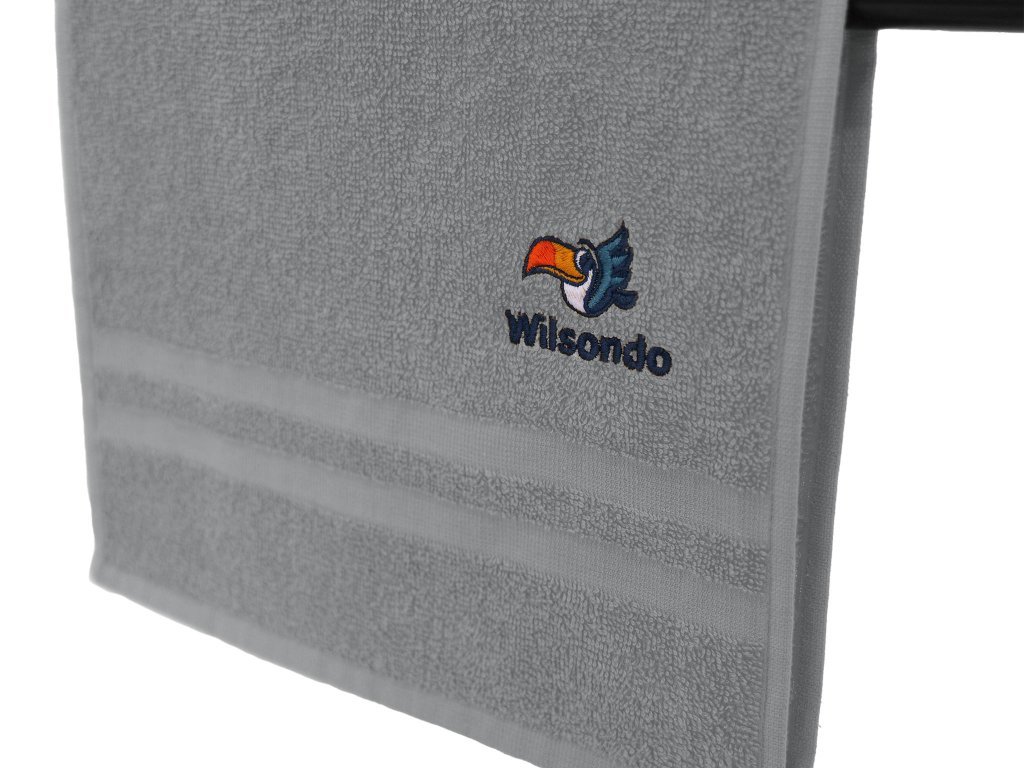 Siva brisača Wilsondo v manjšem formatu 50×30 cm je idealna za roke, obraz ali kot potovalna brisača. Zahvaljujoč 100 % frotirni bombaž z gramaturou 400 g/m² je prijetno mehka, dobro vpija vlago in hitro suši. Kompaktna velikost se prilega vsaki torbi, kopalnici ali pisarni. Ojačana zanka in skrbno obrobljen rob podaljšujeta življenjsko dobo brisače tudi pri redni uporabi. Elegantno vezeno logotip Wilsondo ji daje prefinjen in čist videz.