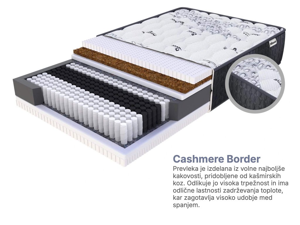 Vzmetnica ima prevleko Cashmere Border. Izdelana je iz najkakovostnejše volne kašmirskih koz. Prevleka je trpežna, prožna in zelo prijetna na dotik. Prevleka ščiti vzmetnico pred poškodbami in zagotavlja udobje med počitkom. Kakovostne lastnosti zagotavljajo visoko udobje med spanjem. Zahvaljujoč proizvodni tehnologiji aktivnih probiotikov Purotex® je prevleka antialergijska, zračna in odporna proti umazaniji in raztezanju. Prevleka ni odstranljiva.