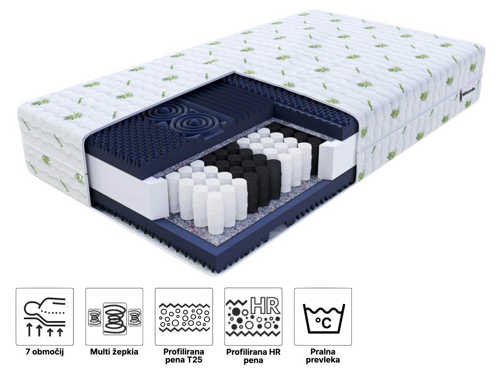 Materialna sestava: Filc, Žepkaste multipocket vzmeti, Poliuretanska pena z gostoto 25 kg/m3, Profilirana HR pena, Prevleka