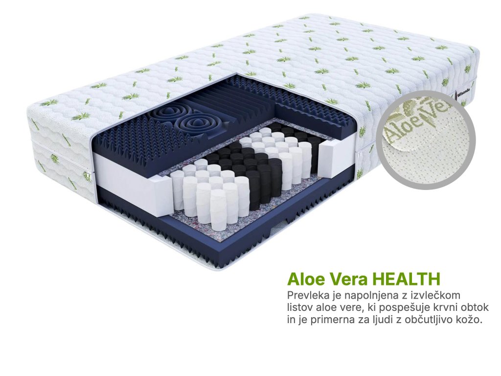 Prevleka vzmetnice je izdelana iz posebnega vlakna z izvlečkom iz Aloe vera, ki ima antibakterijske in antialergijske učinke. Lahko se pere pri temperaturi 30°C, opremljena je s praktično zadrgo in štirimi ročaji za enostavno rokovanje. Zahvaljujoč 3D prezračevalnemu traku je zagotovljena optimalna cirkulacija zraka v vzmetnici.
