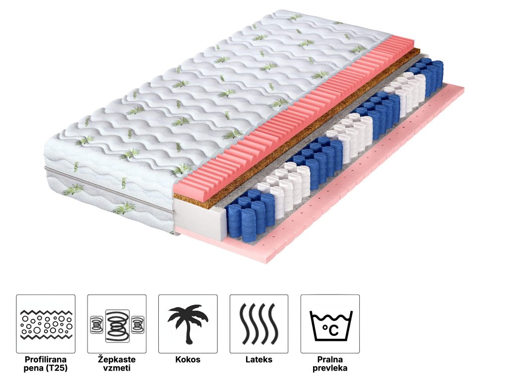 Materialna sestava: Filc, NanoHARD žepkaste vzmeti, Kokosova plast, Poliuretanska PUR pena T25 (4cm), Lateks (3cm) Prevleka